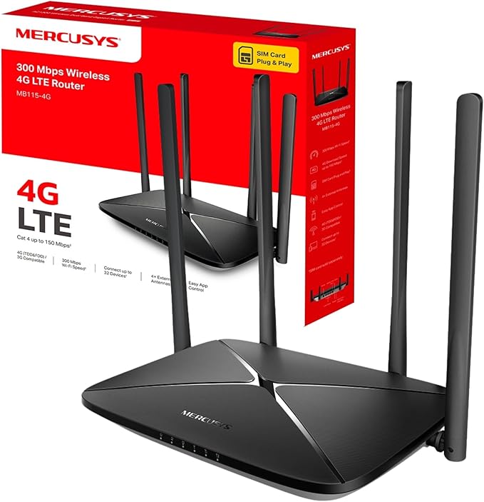 The Mercusys MB115-4G is a 300 Mbps wireless N 4G LTE router that creates a Wi-Fi network from a mobile data connection. It allows you to insert a nano-SIM card to share internet with up to 32 wireless